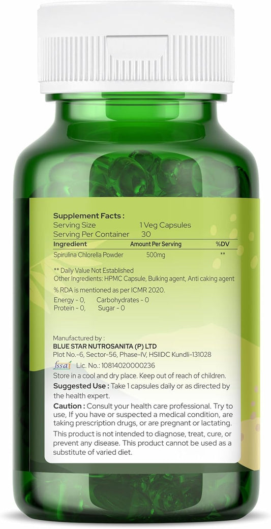 Premium Organic Spirulina Chlorella Capsules with Plant Vitamins - 30 Capsules of 500mg Powder Blend