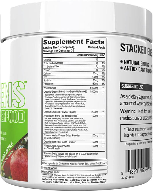Evlution Nutrition Stacked Greens: Raw Superfood with Natural Greens Blend & Micronutrients for Immunity & Hydration - Vegan, GMO-Free - 30 Servings