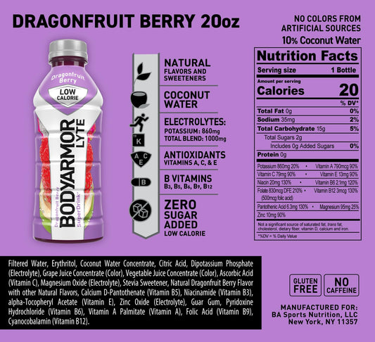 BODYARMOR LYTE Dragonfruit Berry Sports Drink - Low-Calorie Beverage Packed with Electrolytes and Vitamins - 20 Fl Oz (Pack of 6)