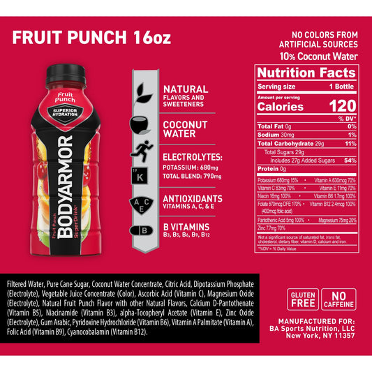 BODYARMOR Sports Drink: Fruit Punch Flavor with Coconut Water, Natural Vitamins & Electrolytes - 16 Fl Oz (12 Pack)