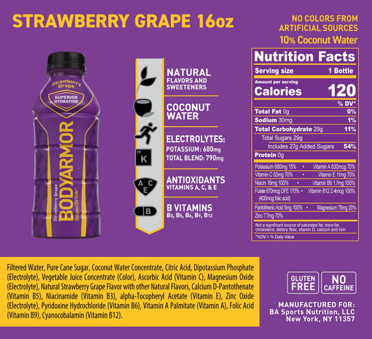 BODYARMOR Strawberry Grape Sports Drink with Electrolytes & Vitamins - 16 Fl Oz (Pack of 12) - Ideal for Athletes - No Preservatives