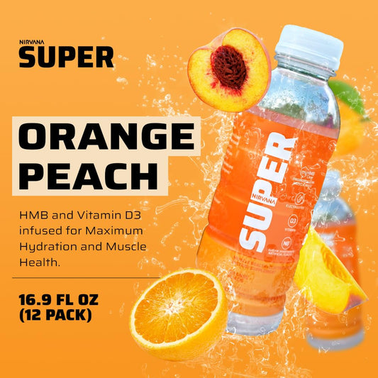 Nirvana Super Water Orange Peach - HMB Infused Vitamin D Beverage for Hydration, Muscle & Bone Support - 16.9 fl oz, 12 Bottles