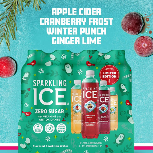 Sparkling Ice Winter Variety Pack - 12 Count, 17 fl oz - Flavored Sparkling Water with Zero Sugar, Vitamins, and Antioxidants - Cranberry Frost, Winter Punch, Apple Cider, Ginger Lime