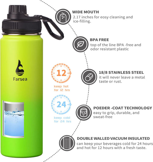 24 oz Farsea Insulated Stainless Steel Water Bottle with Paracord Handle, Silicone Boot, & 2 Lids - BPA-Free Wide Mouth Double Wall, Sweat-Proof