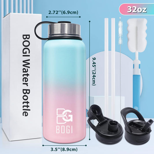 32 oz BOGI Insulated Water Bottle with Straw, 3 Lids - Stainless Steel, Double Wall Vacuum, Sweat-Proof, Wide Mouth - Hot/Cold for Sports, Gym, Office - Blue Pink