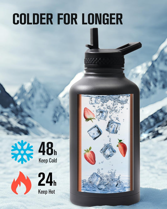 Coolplus 64 oz Insulated Stainless Steel Water Bottle with Straw - Leakproof Double-Walled Vacuum Flask - Keeps Cold for 48 Hrs, Hot for 24 Hrs - Includes Carry Sleeve - Black