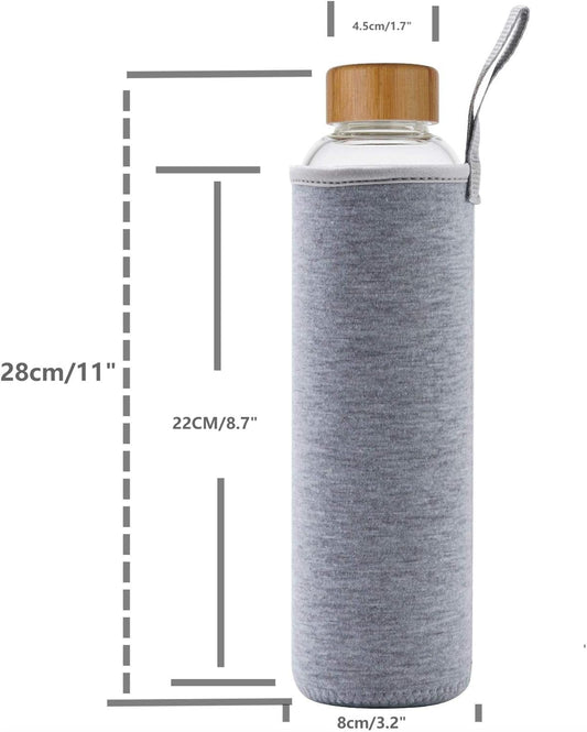 32 oz Glass Water Bottle with Time Marker, Bamboo Lid, Neoprene Sleeve - Reusable, Eco-Friendly, BPA-Free for Travel, Gym, Home - Gray