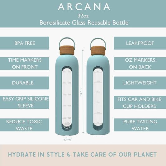 Gelato Blue Glass Water Bottle with Time Marker - 32oz Reusable Borosilicate Bottle for Gym & Travel - Silicone Sleeve - Motivational Gift for Women & Girls