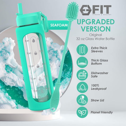 32 oz Glass Water Bottle with Straw Lid, Time Marker, & Sleeve - BPA-Free Large Glass Drinking Bottle