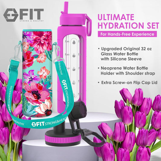 32 oz Glass Water Bottle with Straw Lid, Time Marker, Sleeve, Holder & Strap - Motivational, Wide Mouth, 1L Drinking Bottle - Purple Floral Carrier