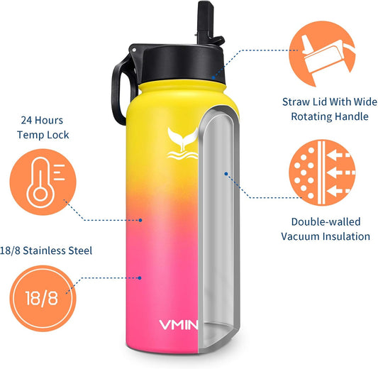 32oz Vmini Water Bottle with Wide Handle Straw Lid, Vacuum Insulated Stainless Steel - Gradient Yellow + Pink