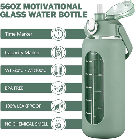 56oz Glass Water Bottle with Straw and Time Marker, Leakproof Large Bottle for Gym and Office with Silicone Sleeve - Olive Green