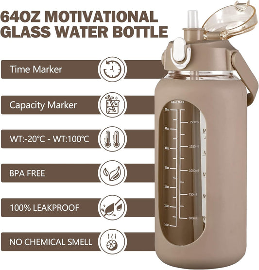 64oz Glass Water Bottle with Straw, Half Gallon Motivational Bottle, Silicone Sleeve, Time Marker, 2L Leakproof Glass Jug, Amber Color, for Gym Home Office