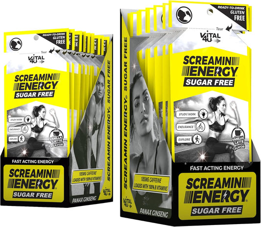 VITAL 4U Screamin Energy® Sugar Free - Vanilla Latte Flavor, 24 Ct - Ginseng, Caffeine, B Vitamins - Maximum Strength Formula