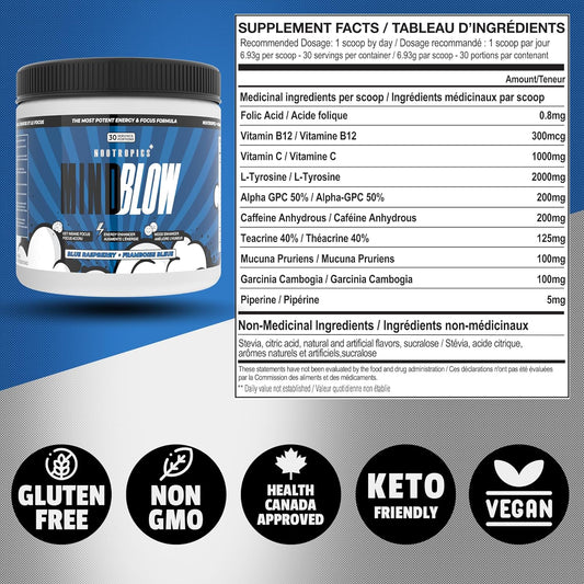 Mind Blow Energy Drink - Nootropic Cocktail for Energy, Focus, and Happiness - Ideal for Students, Entrepreneurs, Hard Workers, and Gamers - 30 Servings