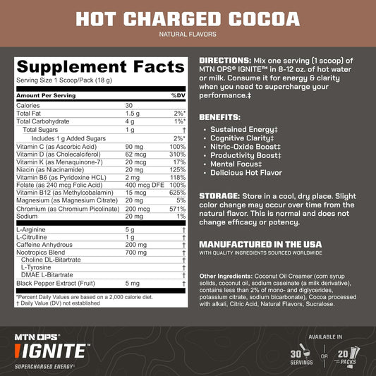 MTN OPS Hot Ignite Charged Cocoa Energy Drink Mix - Focus Enhancer (30 Servings)