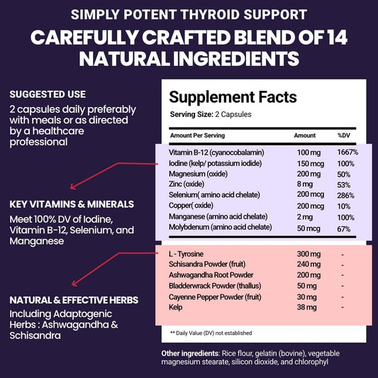 Thyroid Support Supplement for Women and Men - Iodine, Vitamin B12, Ashwagandha, Selenium, Zinc - 60 Capsules, GMP Certified, USA Made