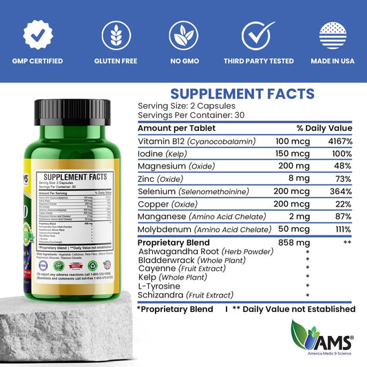 Thyroid Support Supplement with Ashwagandha, Iodine, and Selenium for Mood and Energy - 60 Capsules for Men and Women by America Medic & Science