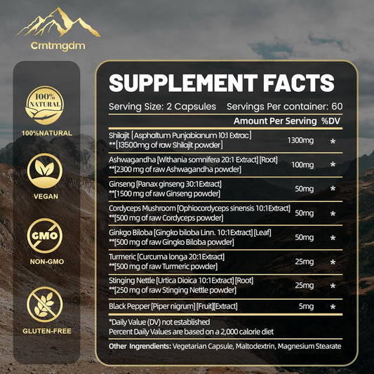 Premium Organic Shilajit Capsules with Ashwagandha - 20,000mg Pure Himalayan Supplement for Vitality and Wellness, 120 Capsules for Men & WomenVendor:JuebingyRegular price $136.98 AUDRegular priceUnit price / per-
