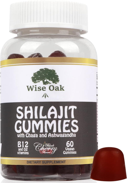 500mg Wise Oak Shilajit Gummies with Chaga, Ashwagandha, B12, D2 Vitamins - Black Cherry Flavored Vegan Ayurvedic Supplement