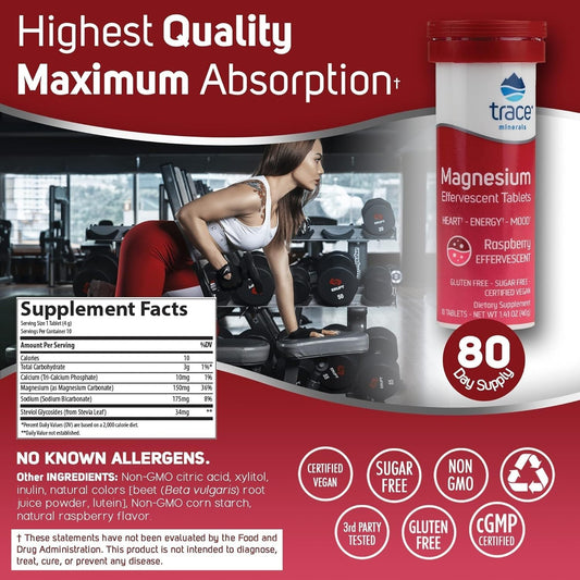 Effervescent Raspberry Magnesium Supplement for Heart Health, Energy, and Sleep - Gluten-Free Trace Minerals - 8 Tubes (80 Servings)