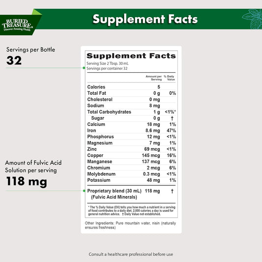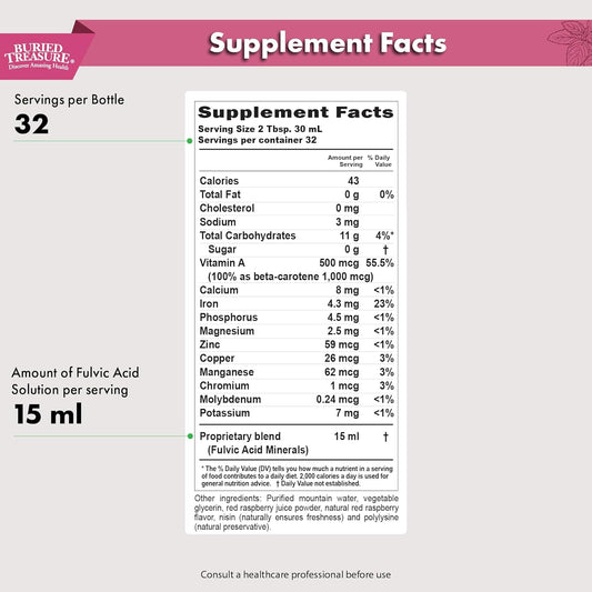 32oz Buried Treasure Fulvic Mineral Complex in Natural Raspberry Flavor - 70+ Plant Derived Minerals, Non-GMO, Electrolyte Replacement, Vegetarian-Friendly