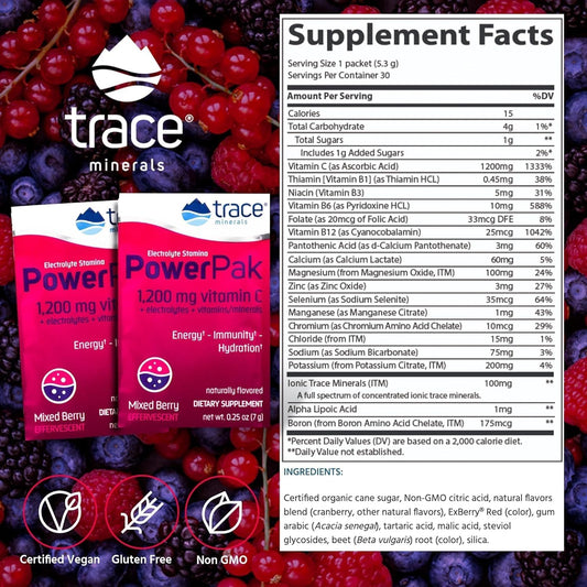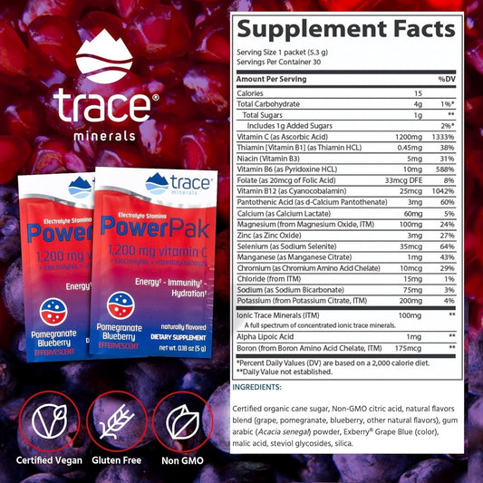 Trace Minerals Power Pak Electrolyte Powder Packets - Immunity & Energy Boost - Pomegranate Blueberry - 30 Packets