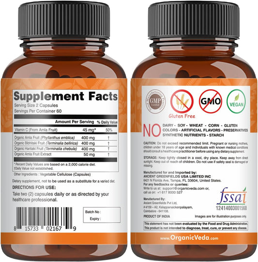 Ultra Concentrated Organic Veda Triphala Capsules with Natural Vitamin C - 120 Vegan Pills for Colon Cleanse, Skin Radiance, Immunity, and Digestion