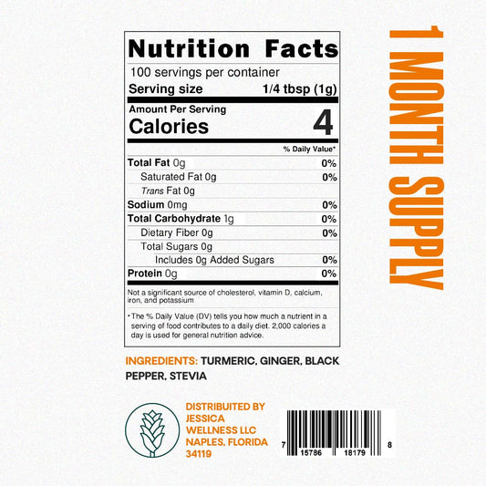 JESSICA WELLNESS Turmeric Tea Blend with Ginger, Black Pepper, and Stevia, 3.5 ozVendor:JESSICA WELLNESSRegular price $150.78 AUDRegular priceUnit price / per-
