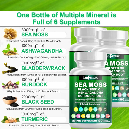 7000mg Sea Moss & Black Seed Oil Capsules with Ashwagandha, Bladderwrack, Turmeric, Burdock, Vitamin C, D3, Minerals - 180 Count