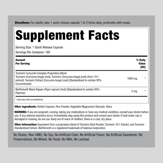 180 Capsules Piping Rock Turmeric Curcumin with Black Pepper 1000mg - Standardized Complex Herbal Supplement, Non-GMO & Gluten Free