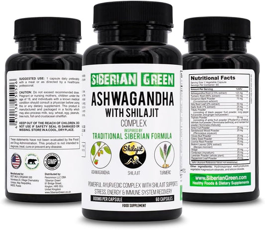 60 Capsules Siberian Green Ashwagandha, Altai Shilajit, and Turmeric Complex for Stress Relief, Energy, and Immune Support