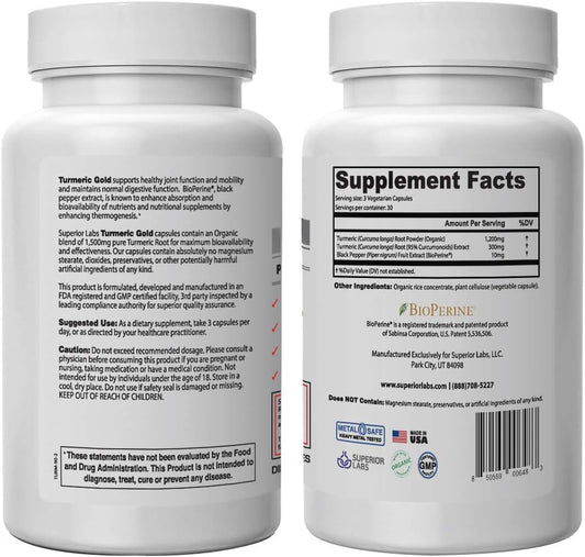 Organic Turmeric Curcumin with BioPerine - 1500mg Pure NonGMO Blend for Joints, Knees, Hips, Immune System - Superior Labs Formula with 95% Curcuminoids and Zero Synthetic Additives