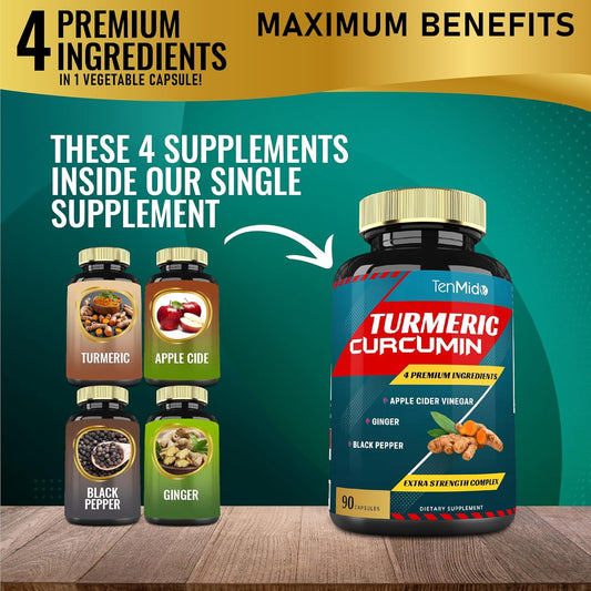 Tenmido Turmeric Curcumin Extract Capsules, 3 Months Supply, 95% Curcuminoids with Apple Cider, Ginger, Pepper - Improves Digestive, Immune Health