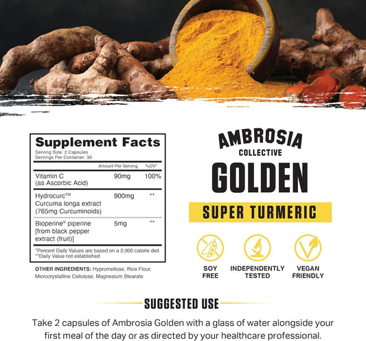 Ambrosia Golden Super Turmeric Capsules - High Curcumin Bioavailability for Gut, Brain & Joint Health - 765mg Curcuminoids - 60 Veg Caps