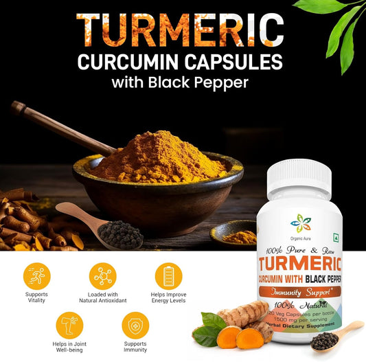 Organic Aura International Turmeric Curcumin Supplement for Wellness, Immunity, Skin, Cleanse, Detox, Bones, and Joints.