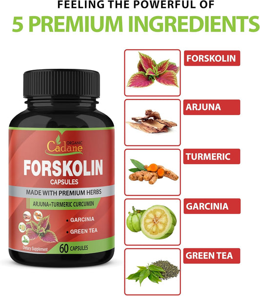 Maximum Strength Organic Cadane Forskolin Capsules with Turmeric, Arjuna, Garcinia Cambogia & Green Tea - Immune System Support - 60 Capsules, 2 Month Supply