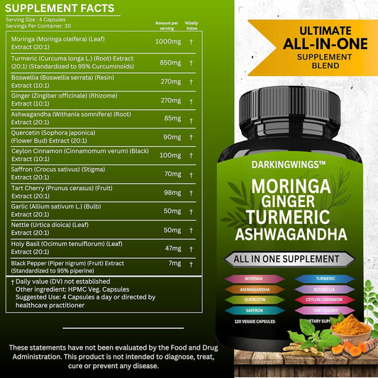 Joint Support Supplement with Turmeric, Moringa, Ginger, Boswellia, and Saffron - Ideal for Men and Women with Ceylon Cinnamon, Tart Cherry, Quercetin, Garlic, Nettle, and Holy Basil - All-in-One Formula