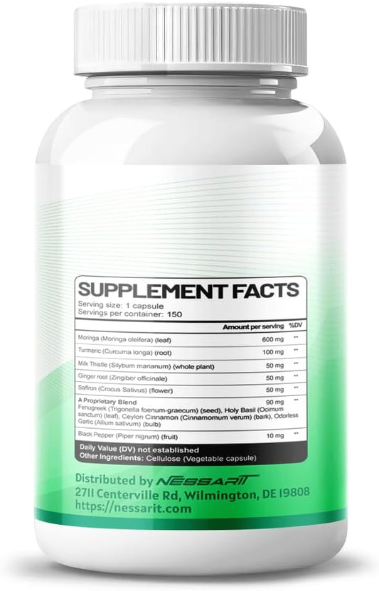 NESSARIT Moringa Supplement: 10-in-1 Natural Blend with Turmeric, Milk Thistle, Ginger, Saffron, Fenugreek, Holy Basil, Ceylon Cinnamon - 150 Count - USA Made & Tested