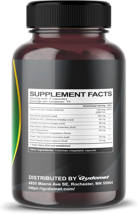 150 Capsules of USA-Made GUDOMET Gymnema sylvestre, Berberine, Turmeric, Bitter Melon, Resveratrol, Green Tea, and Black Pepper