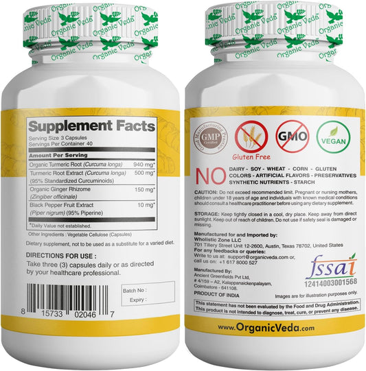 Organic Veda Turmeric and Ginger Capsules - 120 Pills, Joint Support Supplement with Black Pepper - Non GMO, Gluten Free, High Curcuminoids