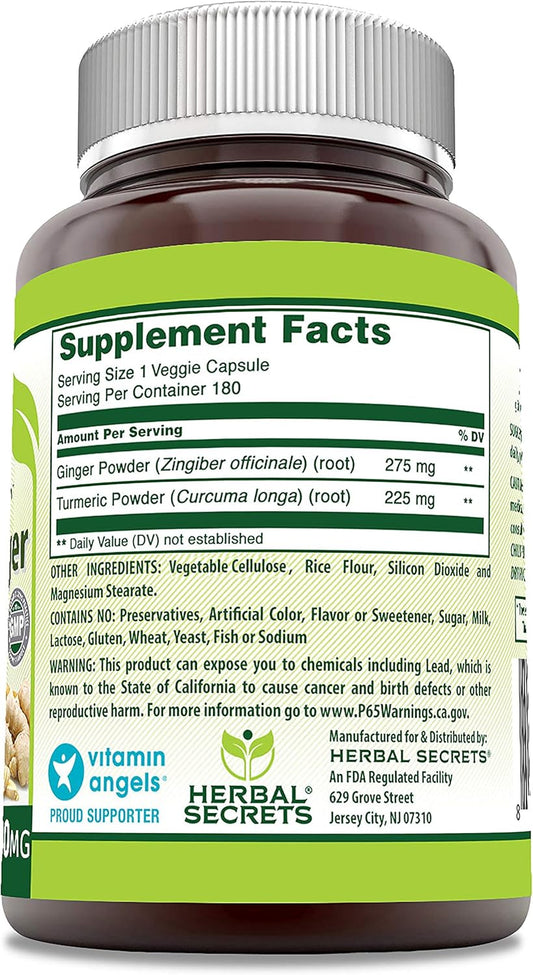 Herbal Secrets Turmeric and Ginger Veggie Capsules - 500 Mg Supplement, Non-GMO, Gluten Free, Made in USA - 180 Count