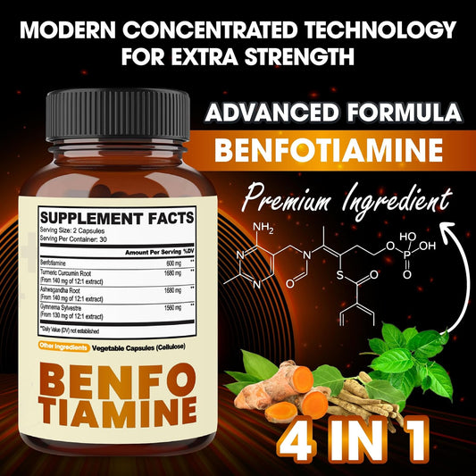600mg Benfotiamine Supplement for Digestion, Energy, and Immune Support - Turmeric Curcumin, Ashwagandha, Gymnema Sylvestre - 120 Capsules (2 Month Supply)