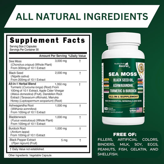 Natural Immune Boosting Supplement with Irish Sea Moss, Black Seed Oil, Ashwagandha, Turmeric, Bladderwrack, Burdock Root, Dandelion, and ACV - Made in USA, Non-GMO, Gluten-Free, Vegan Capsules