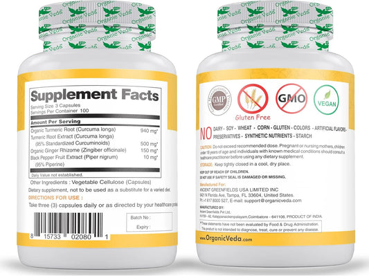 Organic Veda Turmeric and Ginger Capsules - 300 Pills of Turmeric Curcumin with Black Pepper - Joint Support Supplement - Non GMO, Gluten Free (95% Curcuminoids)