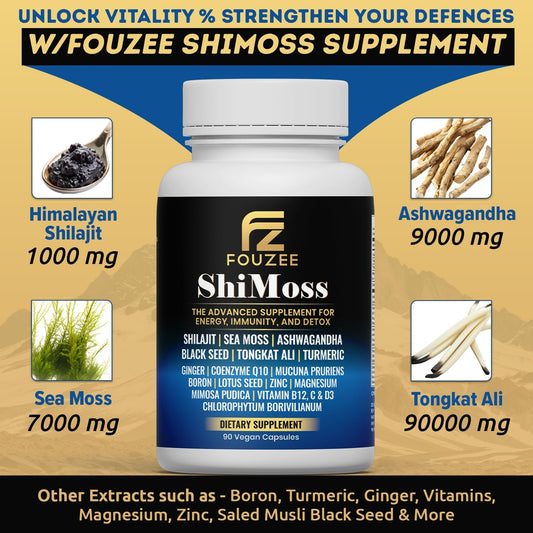 Immunity Boosting ShiMoss Supplement Capsules with Shilajit, Sea Moss, Ashwagandha, Tongkat Ali, Vitamins, and Minerals for Men & Women - 90 Count