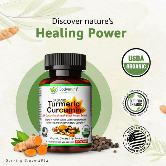 Organic Turmeric Curcumin Supplement with Black Pepper & Ginger, Enhanced Absorption for Joint & Immune Support - 180 Cap, 2250mg