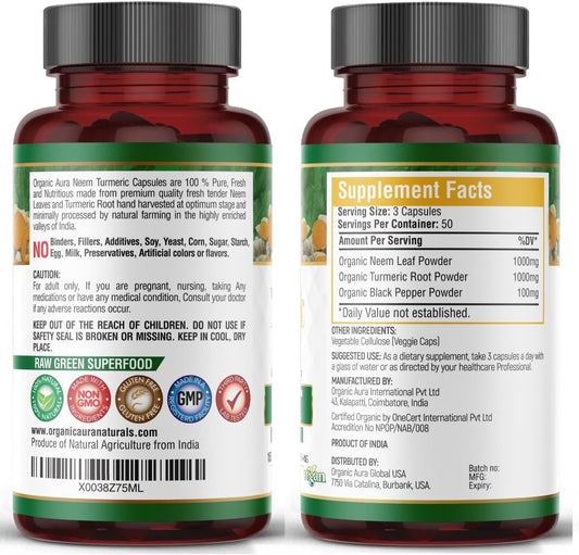 Pure Organic Neem Turmeric Capsules - High-Potency Whole Green Superfood (150 Veg Caps)