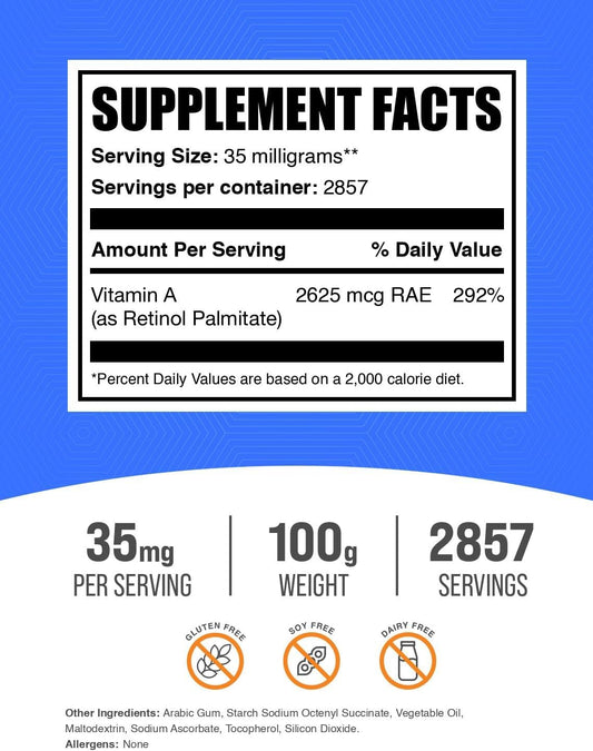 Vitamin A Palmitate Powder 100g - Retinol Palmitate Supplement for Immune & Eye Support - Gluten Free - 35mg per Serving - Pack of 1Vendor:BulkSupplementsRegular price $112.21 AUDRegular priceUnit price / per-