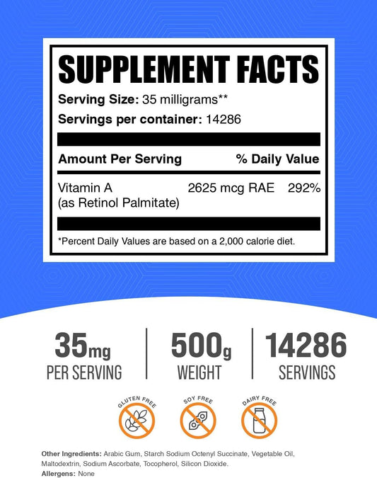 Vitamin A Palmitate Powder - Retinol Palmitate Supplement for Immune & Eye Health - Gluten Free, 35mg per Serving, 500g (1.1 lbs)